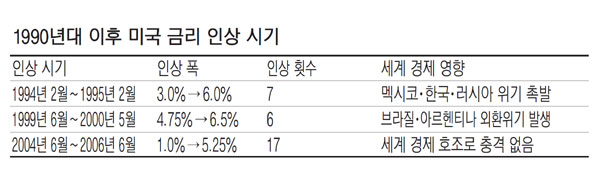 미국은 90년대에 1994년, 1999년, 2004년에 세차례에 걸쳐 기준금리를 인상했다. 그때마다 어김없이 어딘가에서 경제 위기가 발생했다.