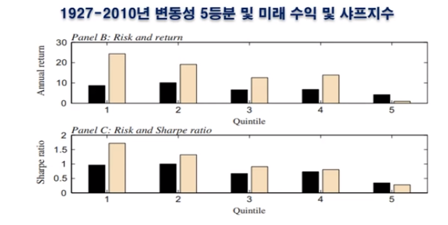 검정색은 시장 수익, 살구색은 상대모멘텀 수익, 가로축은 변동성을 나타낸다.